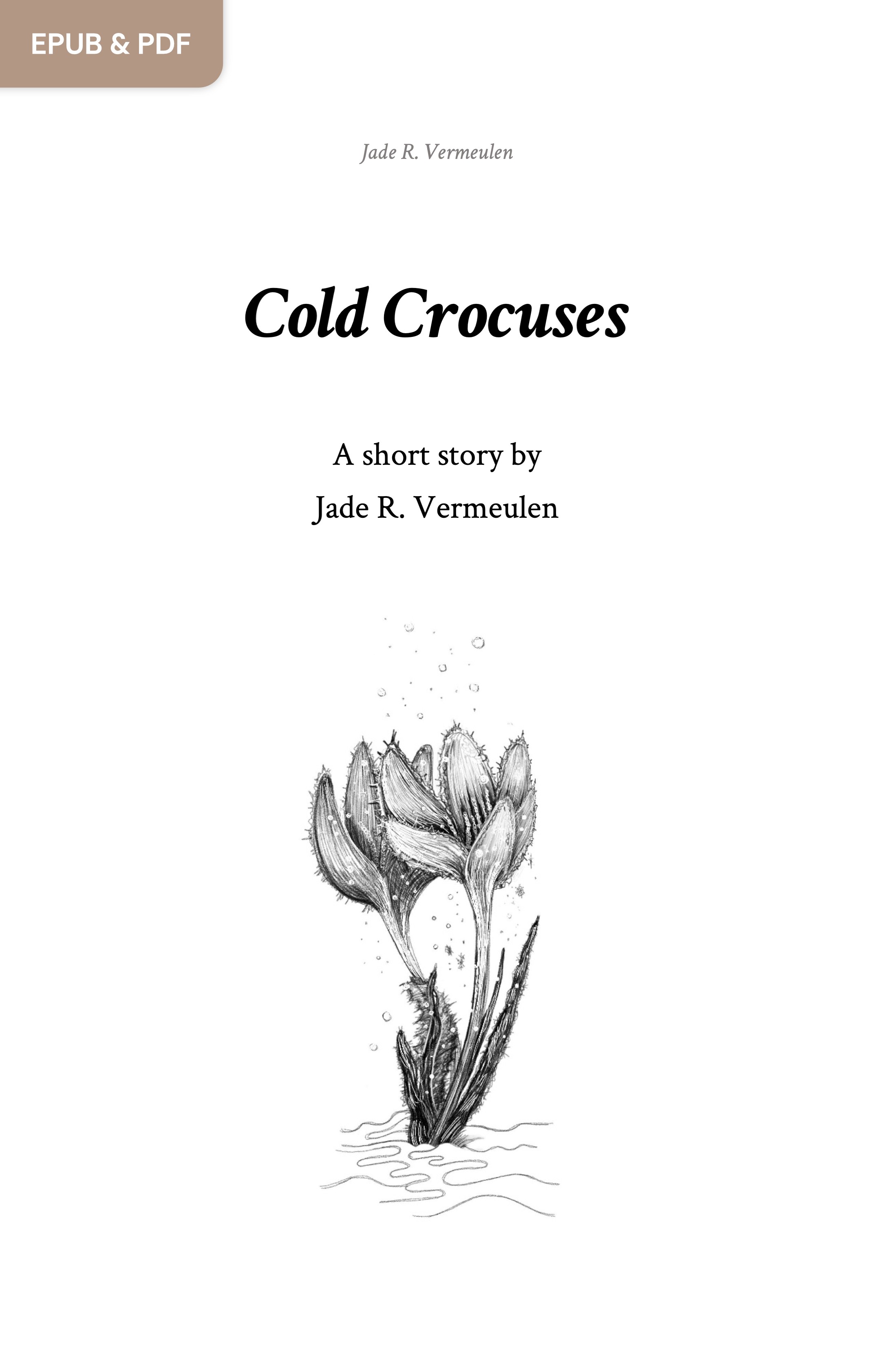 Cold Crocuses is een kortverhaal van ongeveer 5000 woorden over een ontkiemende liefde die al bevriest voor het kan opbloeien. Het gaat over vrienden en vijanden — hoe die lijn soms niet zo gemakkelijk te bepalen is, want geen verhaal is zwart-wit. Verwacht winterse balscènes, liefde en loyaliteit, verraad en verdriet. Steek dit thema in een dark fantasy-jasje en je hebt Cold Crocuses! Het speelt zich af in dezelfde wereld als Tussen Vuur en Regen, maar je kunt dit geheel los daarvan lezen. Het verhaal is beschikbaar in PDF en EPUB, in het Nederlands én Engels (origineel geschreven in het Engels, later vertaald naar het Nederlands). Na aankoop krijg je toegang tot al deze variaties. Het mooiste? Je bepaalt geheel zelf wat je ervoor overhebt! Dus je kunt al wegdromen in deze wereld voor een prijs die goedkoper is dan je dagelijkse overpriced eigenlijk-te-slappe koffie.